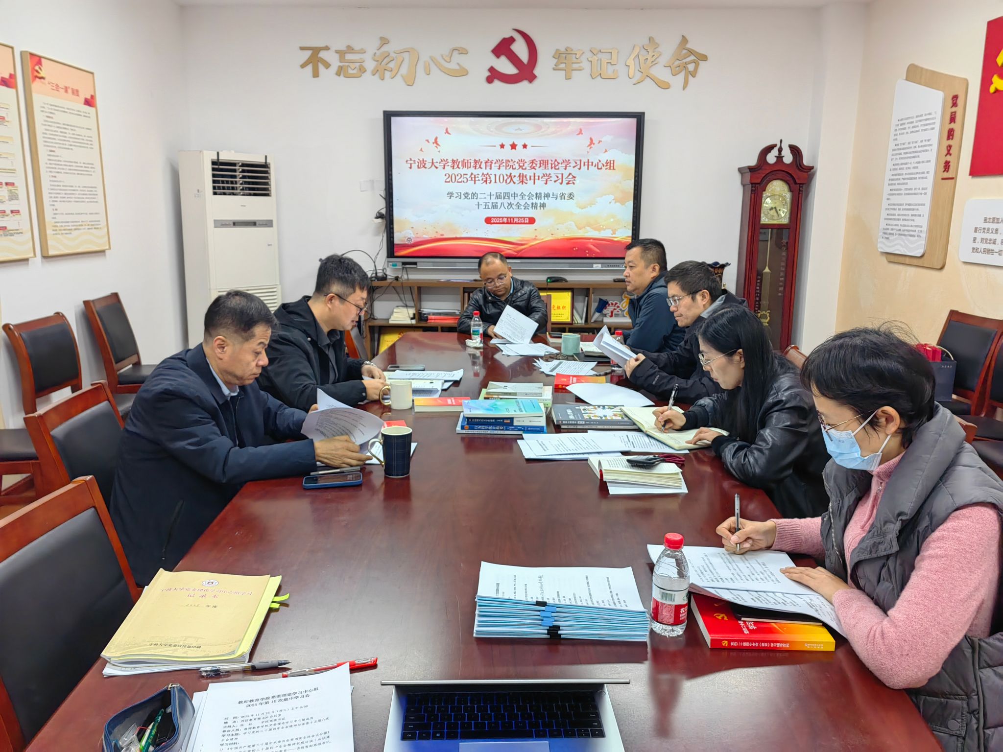 会上,张林书记率先领学党的二十届四中全会精神与省委十五届八次全会精神相关材料。他结合学院实际,重点解读了教育强国建设要求,强调教育发展需融入国家战略大局,既要立足基础教育特色,也要突破学段集中的局限;同时围绕本科招生规模扩大与就业保障、专硕培养模式创新、国际化发展等核心任务提出思考。在解读省委十五届八次全会精神时,他介绍了浙江省科技研发等突出成就以及“人工智能+教育”等重点举措,要求班子成员紧扣全省发展目标谋划学院工作。