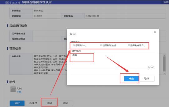 4、 退回操作:点击退回按钮按照弹窗选择退回的环节,输入意见,点击确认,即送至所选退回环节。可以选择退回到学生个人、班主任、辅导员等显示岗位以下的环节)
