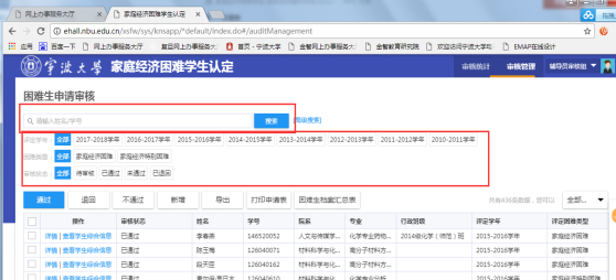 1.审核页面默认展示未经过筛选的全部学生数据,即全部学年、全部困难类型、全部审核状态的学生。点击筛选条件,可筛选学生。系统默认筛选条件有评定学年、困难类型、审核状态个,也可在搜索框按照学号姓名搜索单个学生