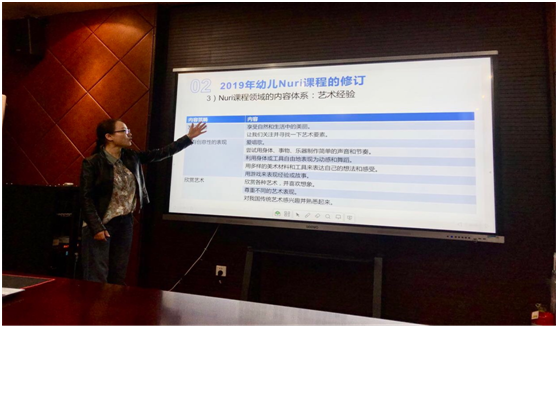 报告会于晚上6点开始。周艳芳副教授从韩国国家标准幼儿教育课程、Nuri教育课程在2019年的修订、第四次标准育儿课程和幼儿课程运作计划四个方面向我们展示了韩国幼儿教育课程。首先,周艳芳副教授指出韩国的学前教育机构由幼稚园和儿童之家的双重系统组成,每个机构都有不同的部门和培训课程。同时以图片和视频的形式展示了韩国幼稚园的园舍内外部环境,其外表天然简单,内部设施完备。其次,周艳芳副教授简要梳理了近些年来韩国幼稚园课程和儿童之家课程的修订考试,并为我们详细地介绍了幼儿Nuri课程的性质、构成方向和内容体系。再次,周艳芳教授分享了韩国标准保育课程的第四次修订,分别从标准保育课程的特征、构成方向和内容领域详细展开;并将标准保育课程和Nuri课程的领域和内容类别进行分析比较。最后,周艳芳副教授对韩国的幼儿教育课程开展计划进行解说,包括Nuri课程的开展时间、具体的工作计划和工作实施的基本原理等方面的内容。