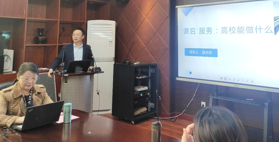 邵光华教授做了题为“课后服务”高校能做什么的报告。邵光华教授对课后服务中高校能做什么做了全面分析。分析指出,高校承担着人才培养、科学研究和地方服务的任务,参与课后服务应是地方服务中的一部分,为了减轻教师负担,是否可以让高校学生参与到课后服务中去,如果可以那么具体如何去操作,如何制定一篮子政策和计划。当然,这只能在大城市或有高校的城市开展,而城区学校“课后服务”带来的问题和冲突更为严重不是吗?其次,高校应该深入一线进行调查研究,发现问题,分析问题,提出解决问题的建议,以使政策更好地执行,或者更为优化,使中小学生能从“双减”中真正获益,能够健康成长。
