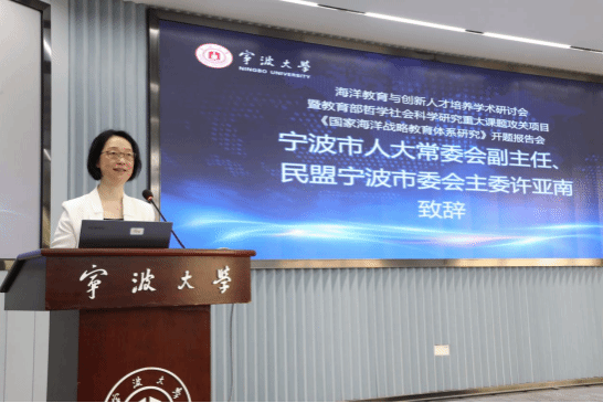 宁波市人大常委会副主任、民盟宁波市委会主委许亚南代表宁波市向本次会议的召开表示热烈祝贺。她表示海洋战略是习近平总书记亲自谋篇布局的大文章,也是“八八战略”的重要一篇。高等教育是宁波民盟的主阵地,宁波民盟在高校中拥有大批海洋教育方面的人才,还有一批涉海领域具有丰富实践经验的盟员,能够为课题研究提供支持。《国家海洋战略教育体系研究》课题组的首席专家刘训华教授作为民盟一员,他一系列与海洋相关的建言献策,得到了全国人大常委会、民盟中央的批示,并取得了显著成效。未来我们致力于构建以参政议政为主体,盟内外资源积极互动,通过人才积聚、智力汇聚打造海洋教育的智力平台,围绕海洋教育发展、海洋科技创新等深入研究,贡献民盟的智慧和力量。