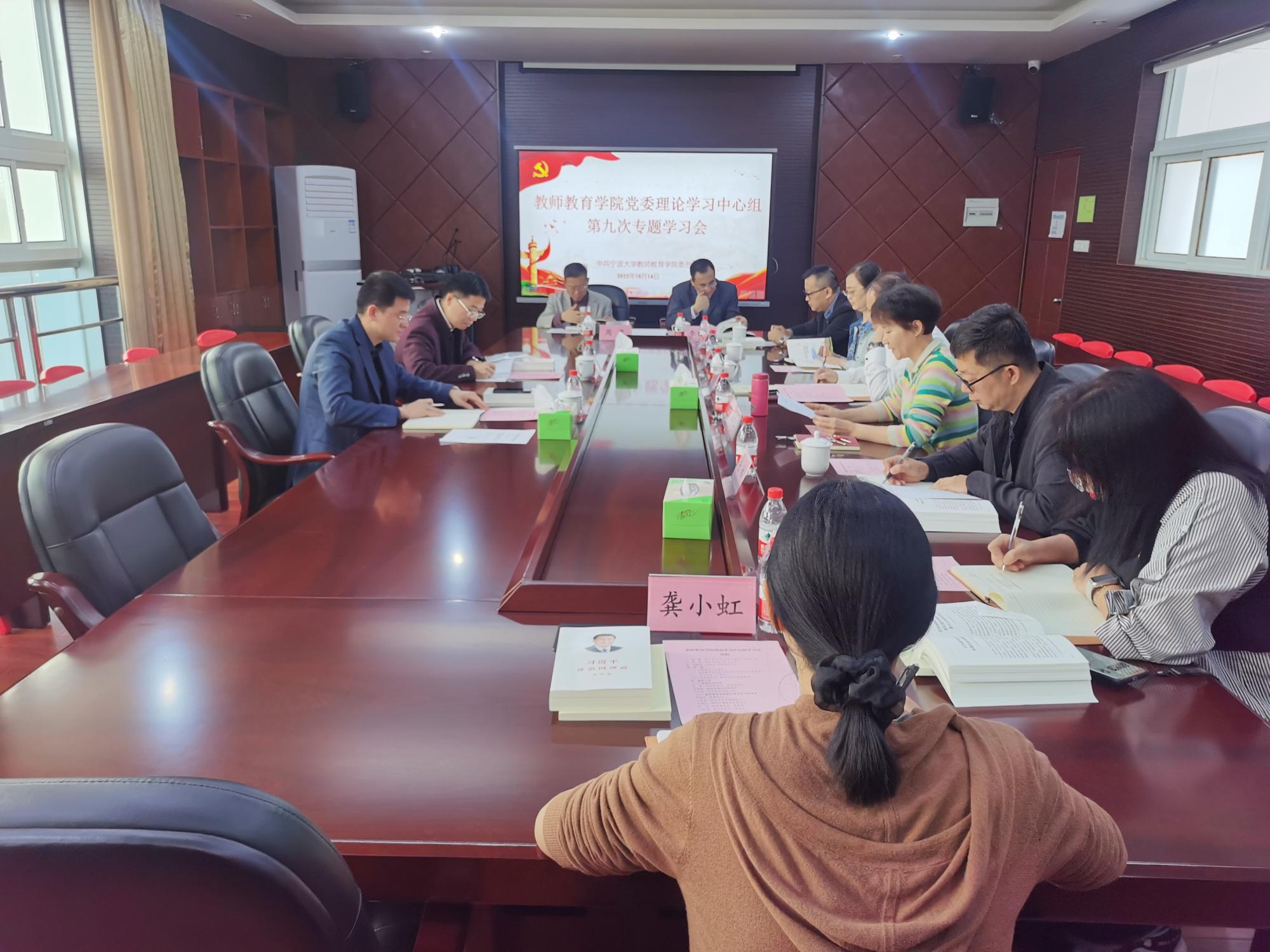 党委理论学习中心组成员分别作交流发言,学院特聘院长贺国庆结合《习近平总书记教育重要论述讲义》,强调要在教师队伍建设质量上下功夫,对学院未来5-10年的人才队伍建设提出了三个发展目标;学院副院长李慧仙紧密围绕培养好教师的目标,提出未来学院将以示范认证为抓手,结合新一轮培养方案修订与春雨书院平台建设,不断提高教师培养质量;学院党委委员兼副院长张林对标学校“双一流”建设要求,结合学院本科人才培养与科研学科建设工作,分享了对于如何落实立德树人根本任务的心得体会与具体措施;学院党委委员兼副院长刘希伟强调推动研究生教育应适应党和国家事业发展需要,提出学院将继续致力于提高导师队伍水平与人才培养质量;学院党委副书记、纪委书记王立衡指出,如今思政工作面临诸多挑战,学院将以专业化、现代化为抓手,用心用情服务学生成长全过程;学院党委委员周勇结合我国义务教育性质、义务教育培养目标定位、义务教育课程教学改革,分享了对于习近平总书记教育重要论述的体会;学院党委委员李伟强联系自身教育教学实际情况,提出了教育工作者在加快推进教育现代化的新征程中培养担当民族复兴大任的时代新人的具体努力方向。学院党委委员龚小虹结合思政教育谈体会,呼吁日后做大做强已创办12年的“滴水行动”支教品牌,以加强师德师风建设。