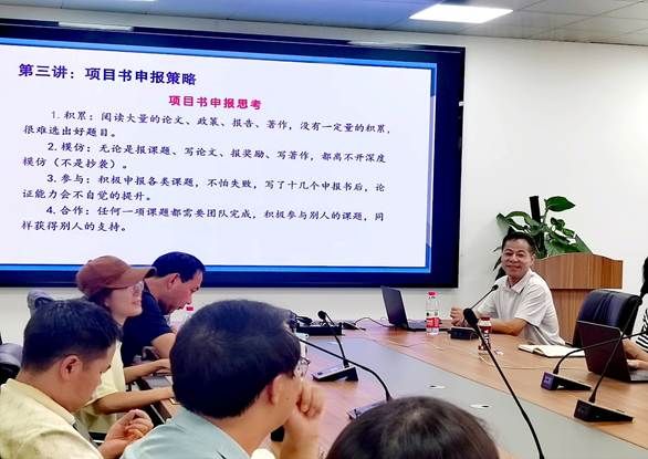 在学术论文写作方面,会议重点讨论了文科科研创新的特殊性。张宝歌教授分别从期刊的选择、论文的投稿、论文的选题、论文的撰写四方面为青年教师作高水平论文撰写指导,建议青年教师在创新性方面要注重从学术思想一脉相承、补充创新及预设性观点、研究方法创新等角度突破。此外,针对文科创新常被忽视、可视性指标主导评价体系等问题,研究团队提出建立多元评价标准,创新性地提出技能类科研成果评价体系。
