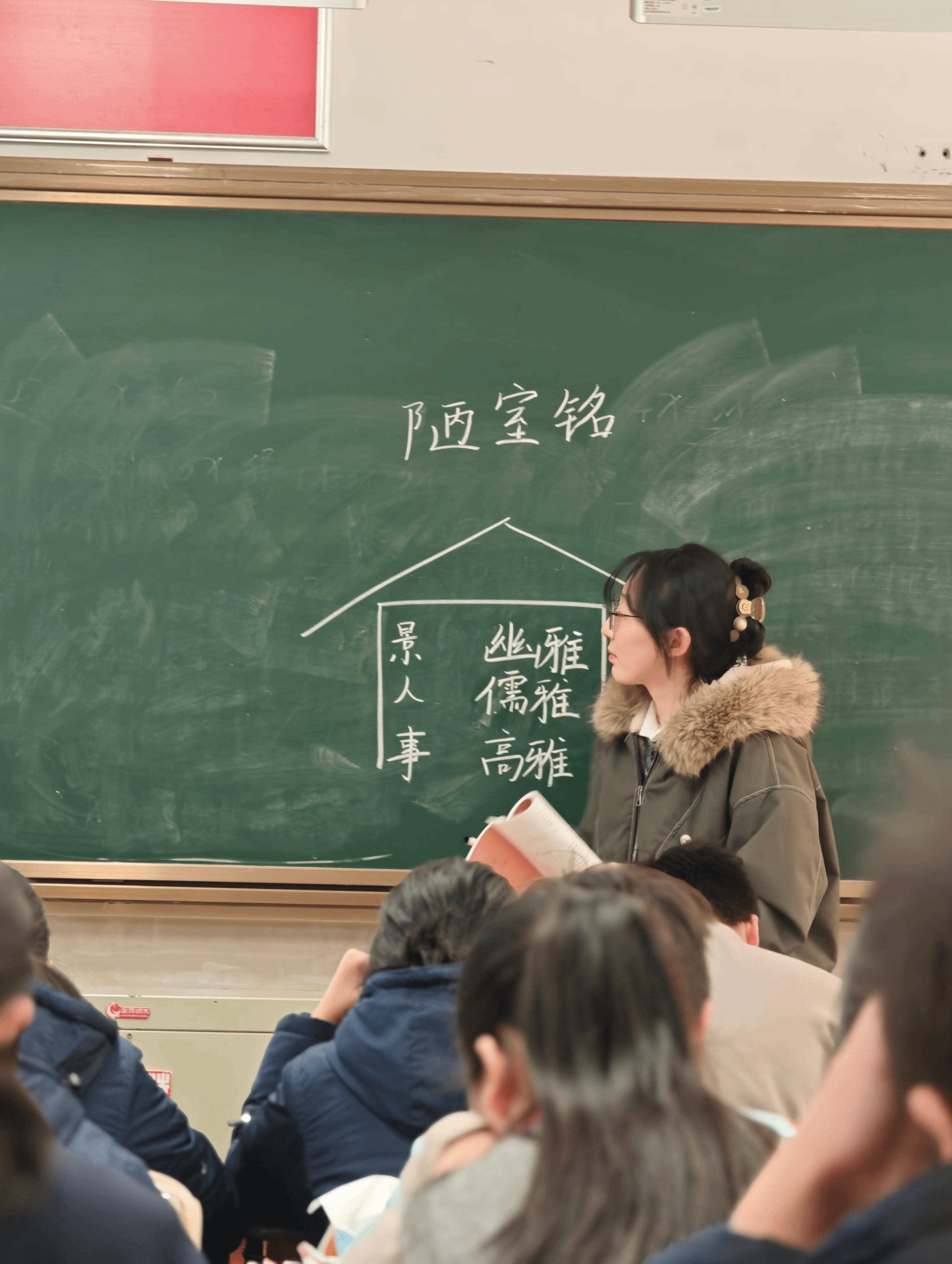 研究生代表秦仔怡执教的《陋室铭》则以“叩问本心:畅谈理想之家”导入,通过四个循序渐进的朗读活动构建教学主线,贯彻落实冯铁山教授的“四步朗读法”。活动一“初读有声·见其象”,学生圈画文中景物、人物、事物,初步构建陋室之象;活动二“再读有情·品其韵”,品析文中情语,读出作者安贫乐道、淡泊名利的情感;活动三“三读有疑·辩其理”,设置“陋”与“不陋”的微型辩论,引导学生思辨文本内涵;活动四“四读有形·悟其神”,学生通过演绎式朗读,内化刘禹锡高洁傲岸的精神品格。