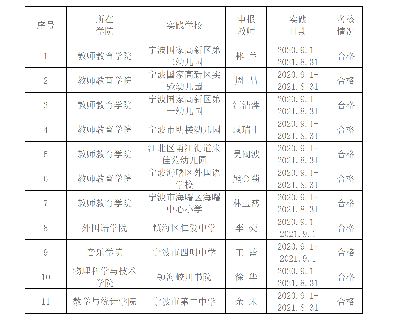 根据《探花直播 教教师教育实践能力培养实施办法(试行)》(宁大政〔2020〕40号)文件,教务处对2020-2021学年教师教育实践能力培养考核合格的相关人员进行公示,具体名单如下: