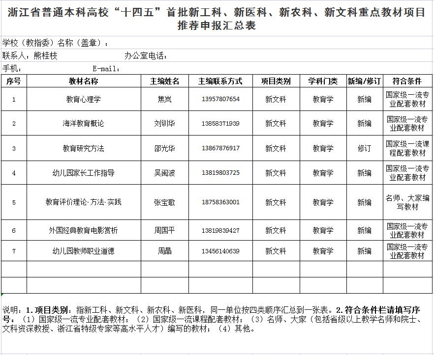 根据《关于开展浙江省普通本科高校“十四五”首批新工科、新医科、新农科、新文科重点教材建设项目申报工作的通知》要求,经会议评审,现对我院推荐申报结果进行公示(排名不分先后,按姓氏拼音首字母顺序排序):