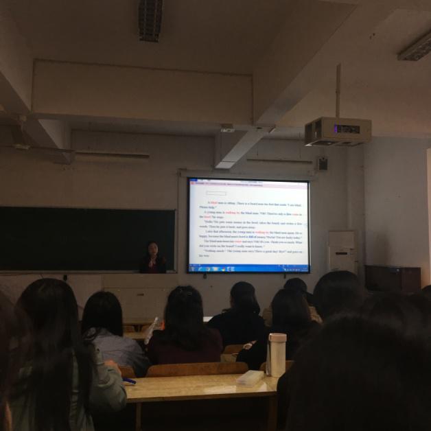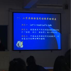 讲座开始,周老师分享了几次考编面试的经历,调动了学生的兴趣。周老师首先解释了语篇教学中的若干问题和介绍了语篇阅读教学的过程以及误区,之后向同学们提出了教学目标:养成意群阅读的习惯。最后老师给同学们提供了一些培养英语阅读能力的建议。