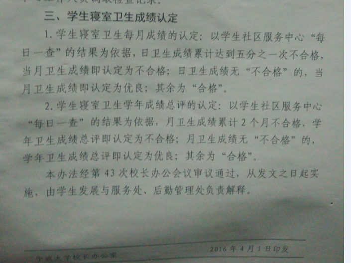 根据宁大政〔2016〕23号文件《关于印发〈探花直播 学生寝室卫生检查实施办法(试行)的通知〉》要求,学生社区负责对学生寝室卫生进行检查。学校检查时间为:周一到周三普查,周四、周五复查前面不合格的寝室,学院每周日进行寝室卫生的常规检查,学校和学院的卫生检查结果共同计入当月寝室卫生成绩的考核。具体考核原则如下: