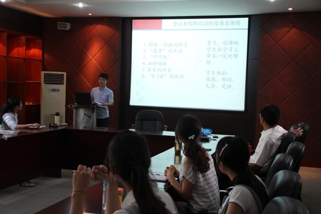 江挺以中小学生假期的身体踪迹为主题将自己的论文研究与大家进行了交流和分享,研究方法为大家较为陌生的身体踪迹学,这是反思教育实践的一个新视角。其核心观点是:通过学生身体运行踪迹的深层力量机制的挖掘,试图发现由身体视角折射出来的教育真相;学生在假期里奔忙,穿梭于能为他们提高学业成绩或才艺技能的各类培训班与补习场所里;哪里有教育价值的导向,哪里就有被导向的市场化社会教育。学生及其家长为了他们的幸福、前途与命运所迸发出来的惊人力量,足以让教育行政部门文本中的教育理想化为华彩且轻飘的泡沫。交流过程中,老师和研究生都对此研究提出了自己的问题和看法,引起了大家广泛的交流。
