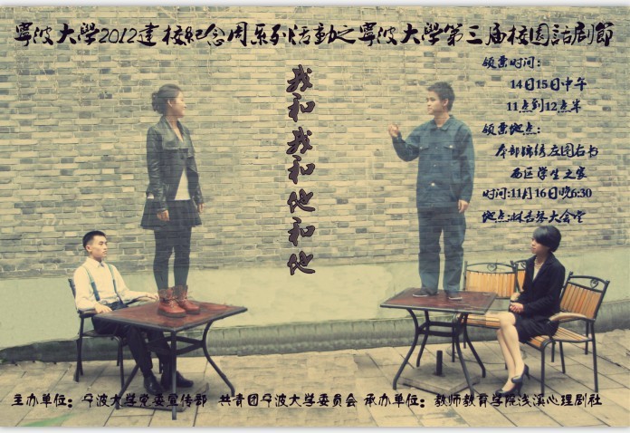 你们好,由探花直播 党委宣传部、共青团探花直播 委员会联合主办,我院浅溪心理剧社承办的探花直播 2012建校纪念周之探花直播 第三届校园话剧节之探花直播 浅溪心理剧社《我和我和他和他》专场演出将于11月16日(本周五)晚18:30在探花直播 林杏琴会堂上演,敬请关注!