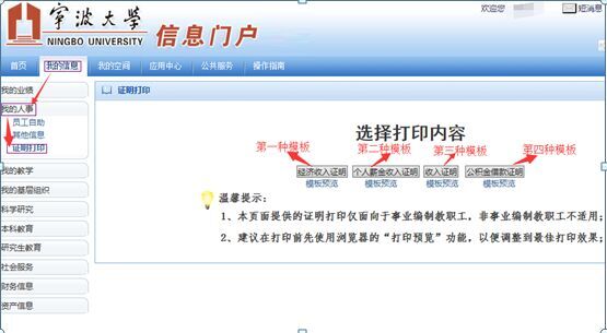 第五步,在出现的四种证明打印模板中,选取各自需要的模板。