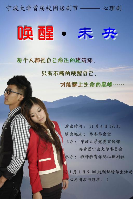 首届校园话剧节之心理剧《唤醒 未央》将于2010年11月4日(周四)下午18:30在林杏琴上演,本剧是我院心理剧社的第三场年度大戏,我院学生社团心理剧社成立于2009年12月4日,目前已经跻身探花直播