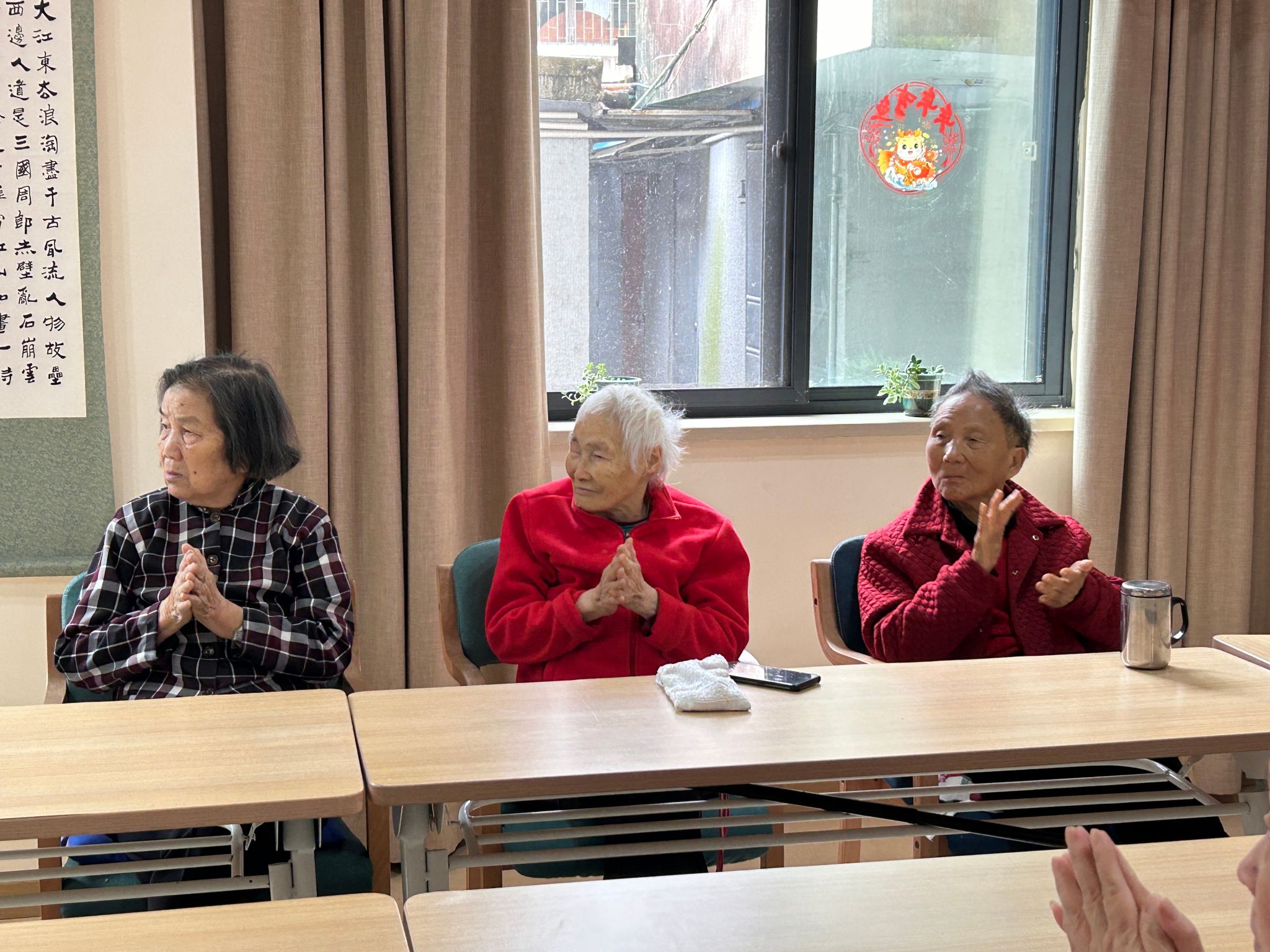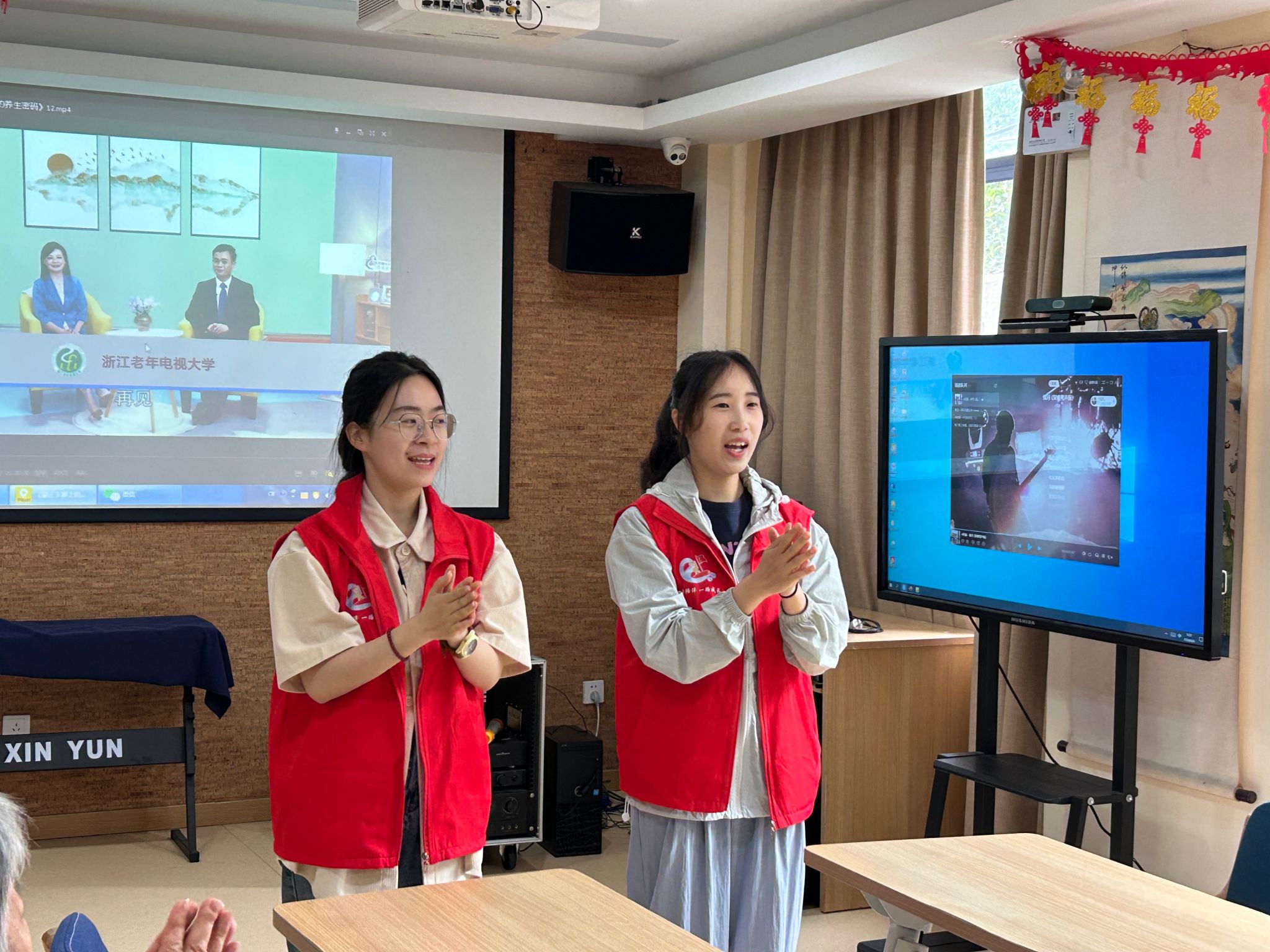 第一个节目是拍手操《肩头手操》,“先拍拍手、再拍拍头、拍拍肩”,同学们带领爷爷奶奶一起做充满活力的拍手操,展示了青春向上的活力,爷爷奶奶们被这种气氛所感染,和大家一起互动起来。