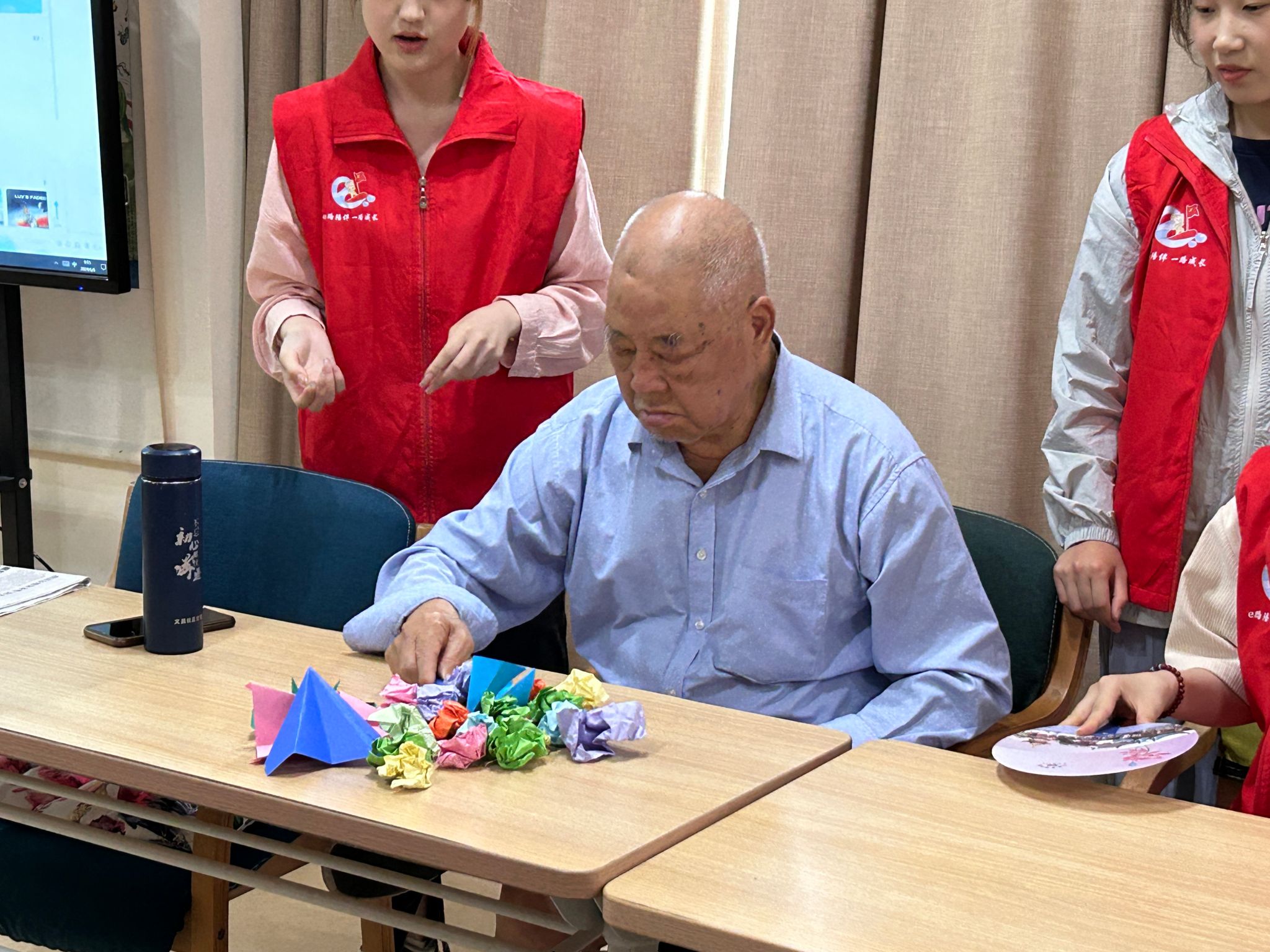 第二个有趣的游戏是个人游戏《欢乐铲铲铲》,游戏开始后,每个爷爷奶奶用铲子铲起桌子上的纸球,每人在30秒内铲完所有纸球即为获胜,在志愿者们的帮助下,每个爷爷奶奶都成功完成了挑战。