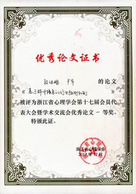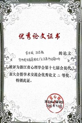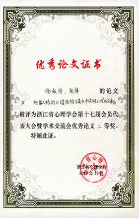 心理学研究所研究生提交的参评论文共获得一等奖1篇,二等奖2篇,三等奖4篇。其中,2015级段继鹏同学等提交的论文“基于群体信息的行为预测机制”荣获一等奖;2015级李月皎同学等提交的论文“行为发出者意图在广义互惠中的影响”和2015级杨张祥同学等提交的论文“施虐人格的心理结构及其与冲动性人格的关系”荣获二等奖;此外,陈满、韩尚锋、王红芳、周玮四位同学提交的论文分别荣获三等奖。